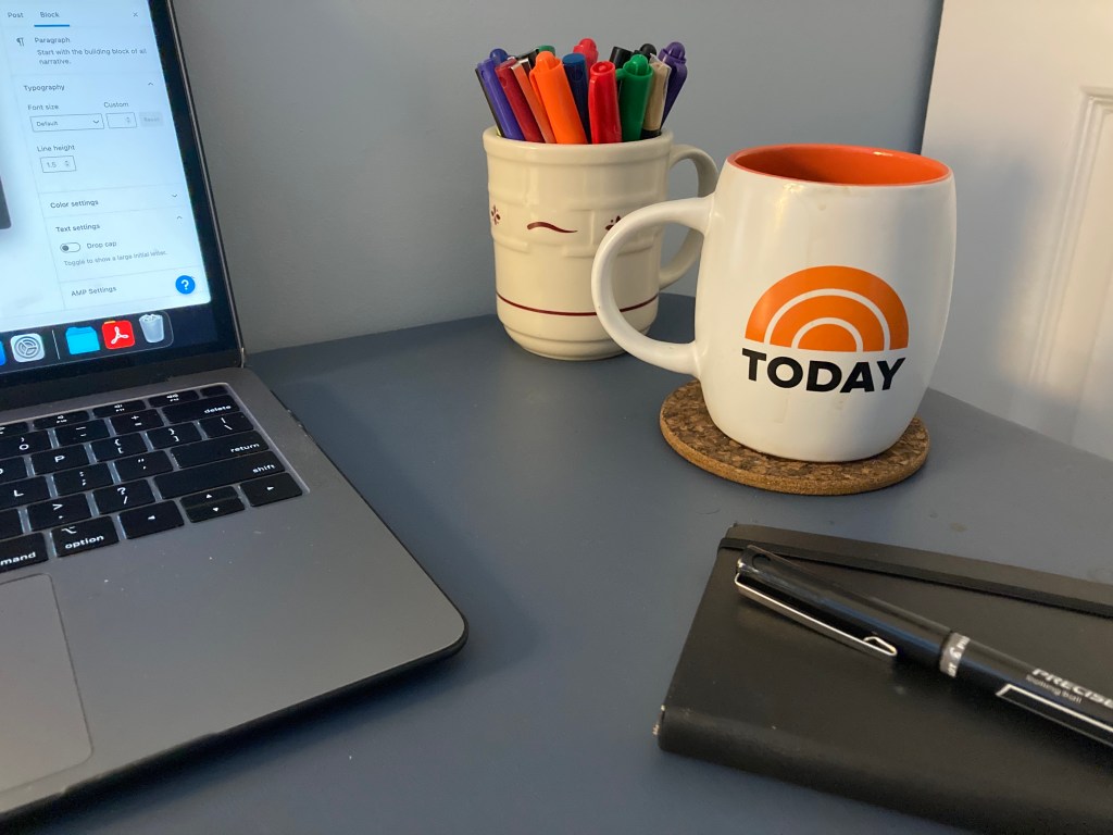 I wrote an episode about dealing with writer’s block. The opening shot featured my desktop, including my favorite coffee mug at the time, which read, “Whenever work feels overwhelming, remember you’re going to die.”